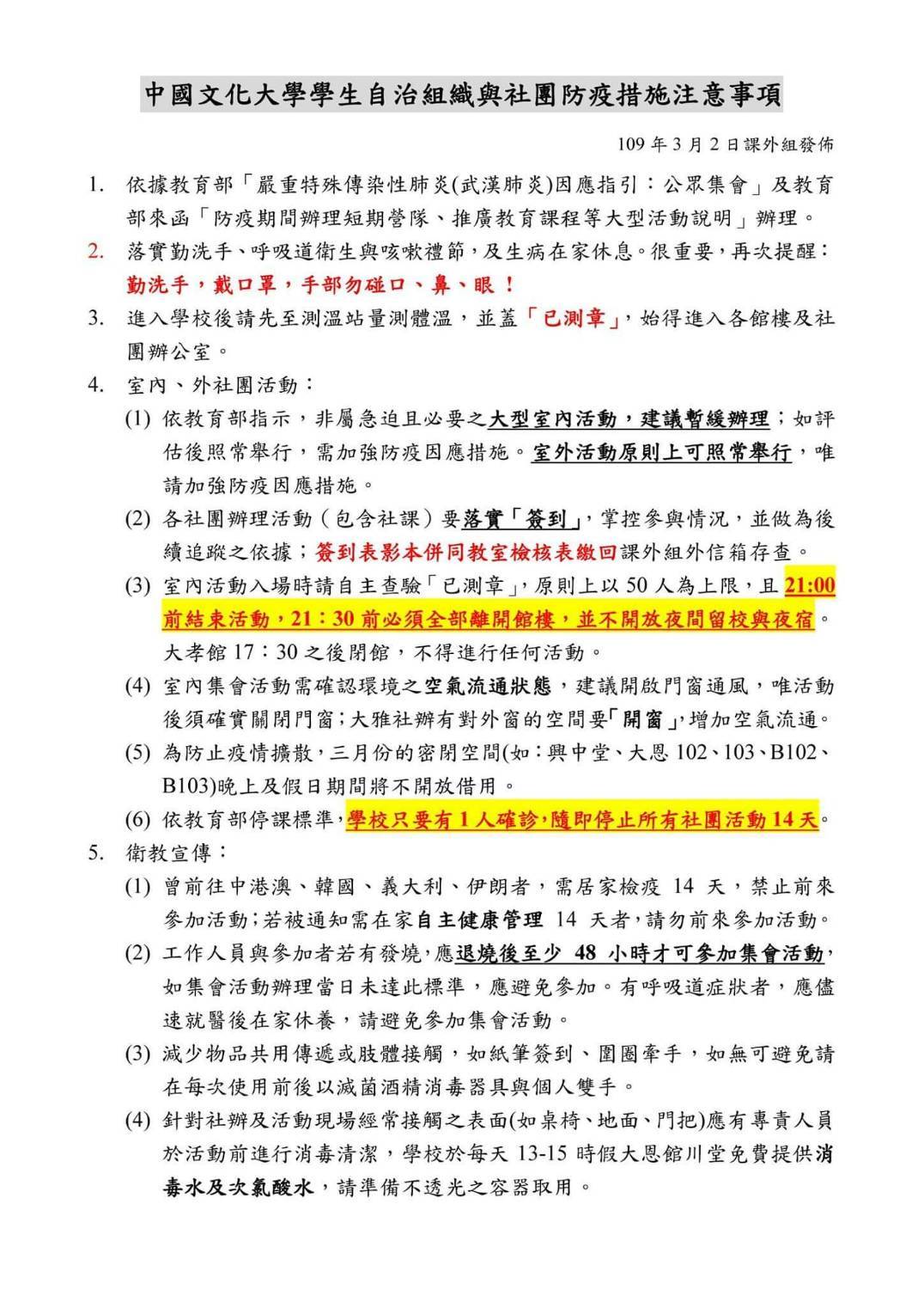 中國文化大學學生自治組織與社團防疫措施注意事項